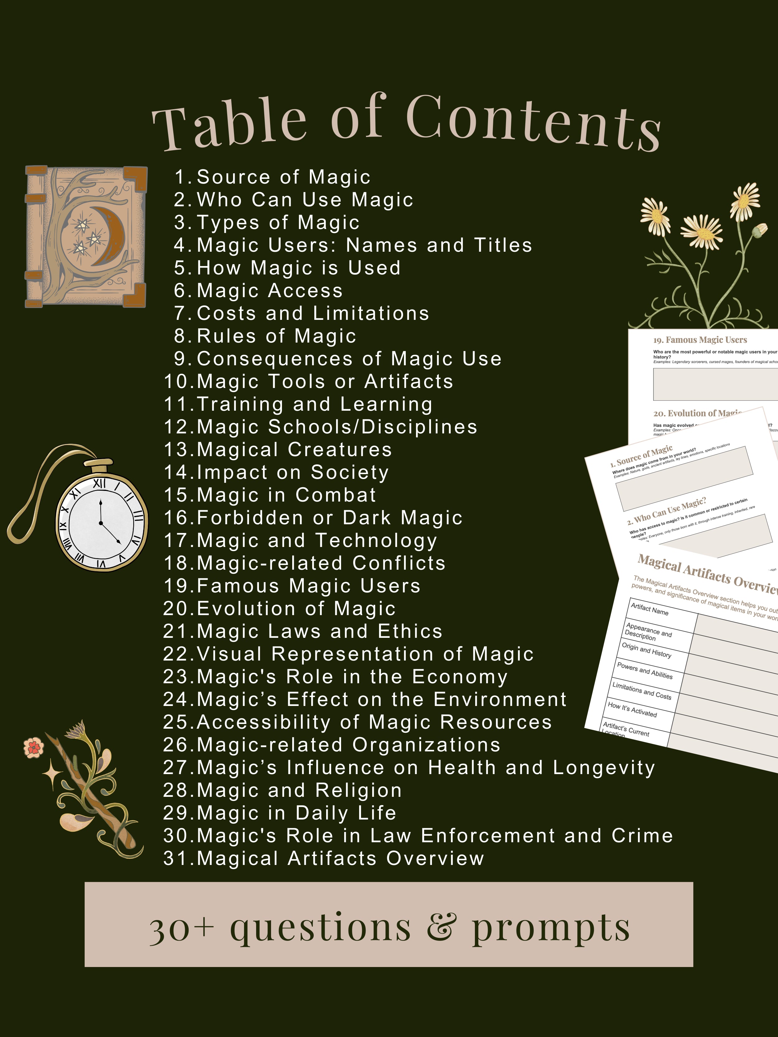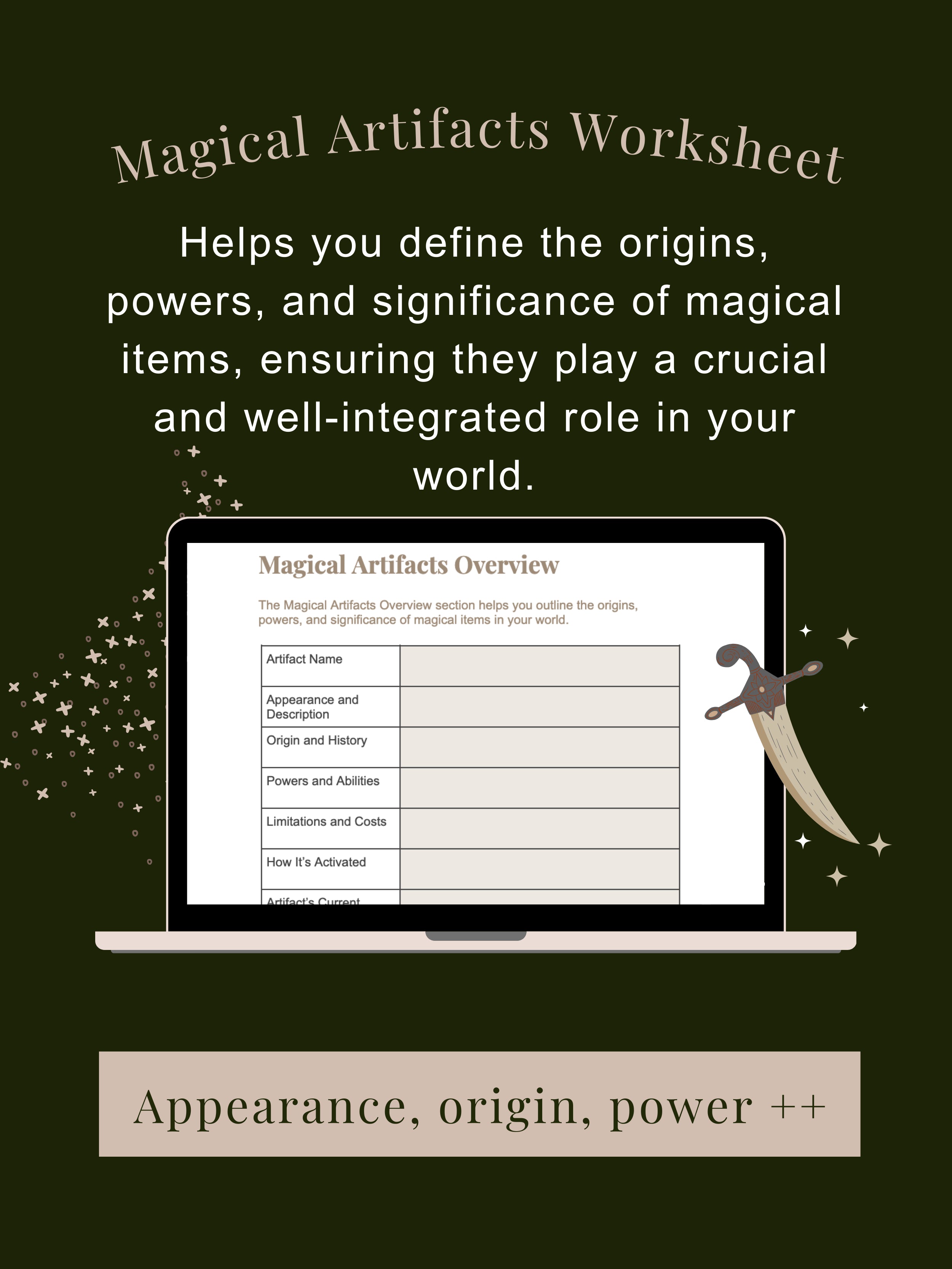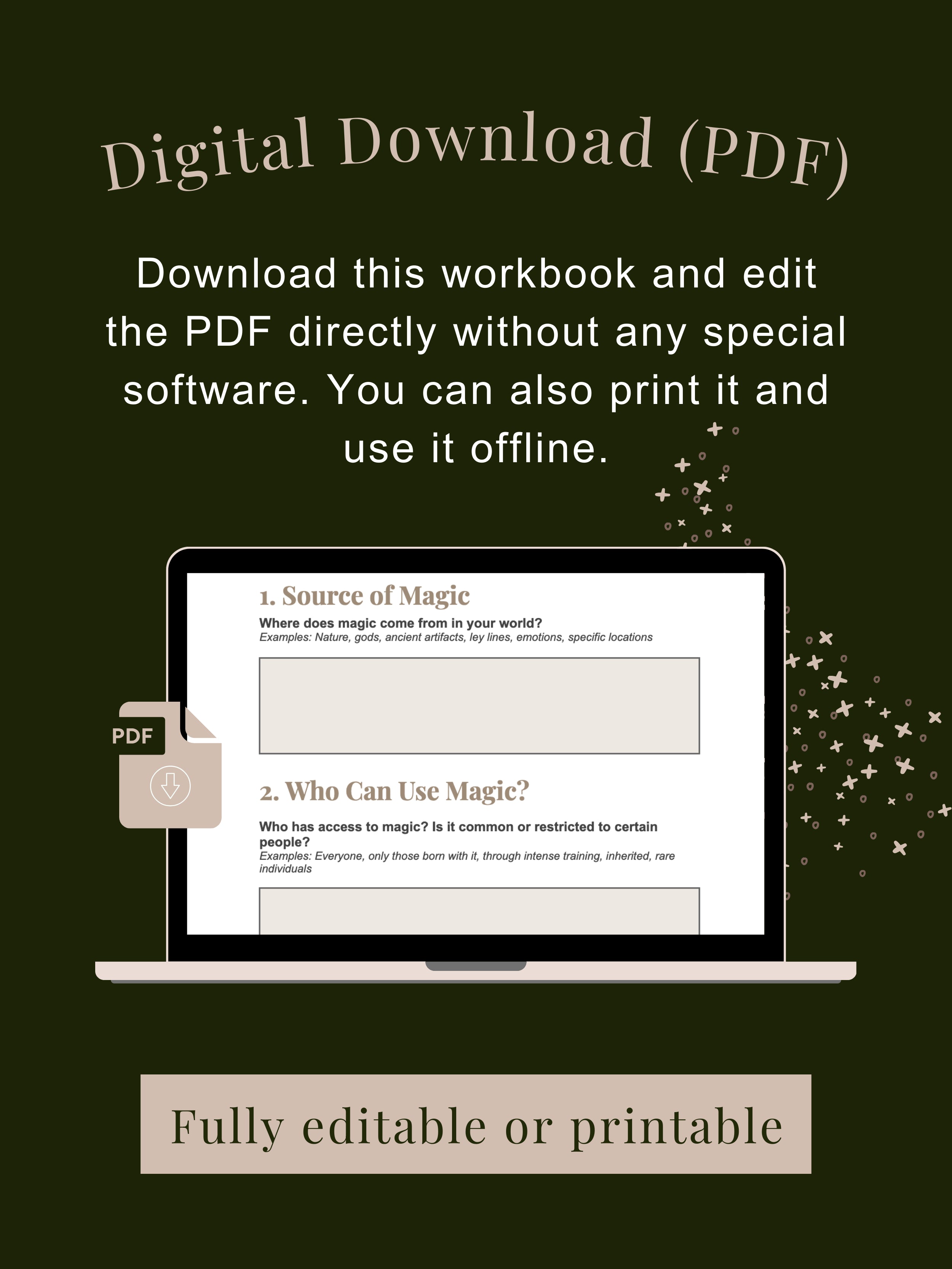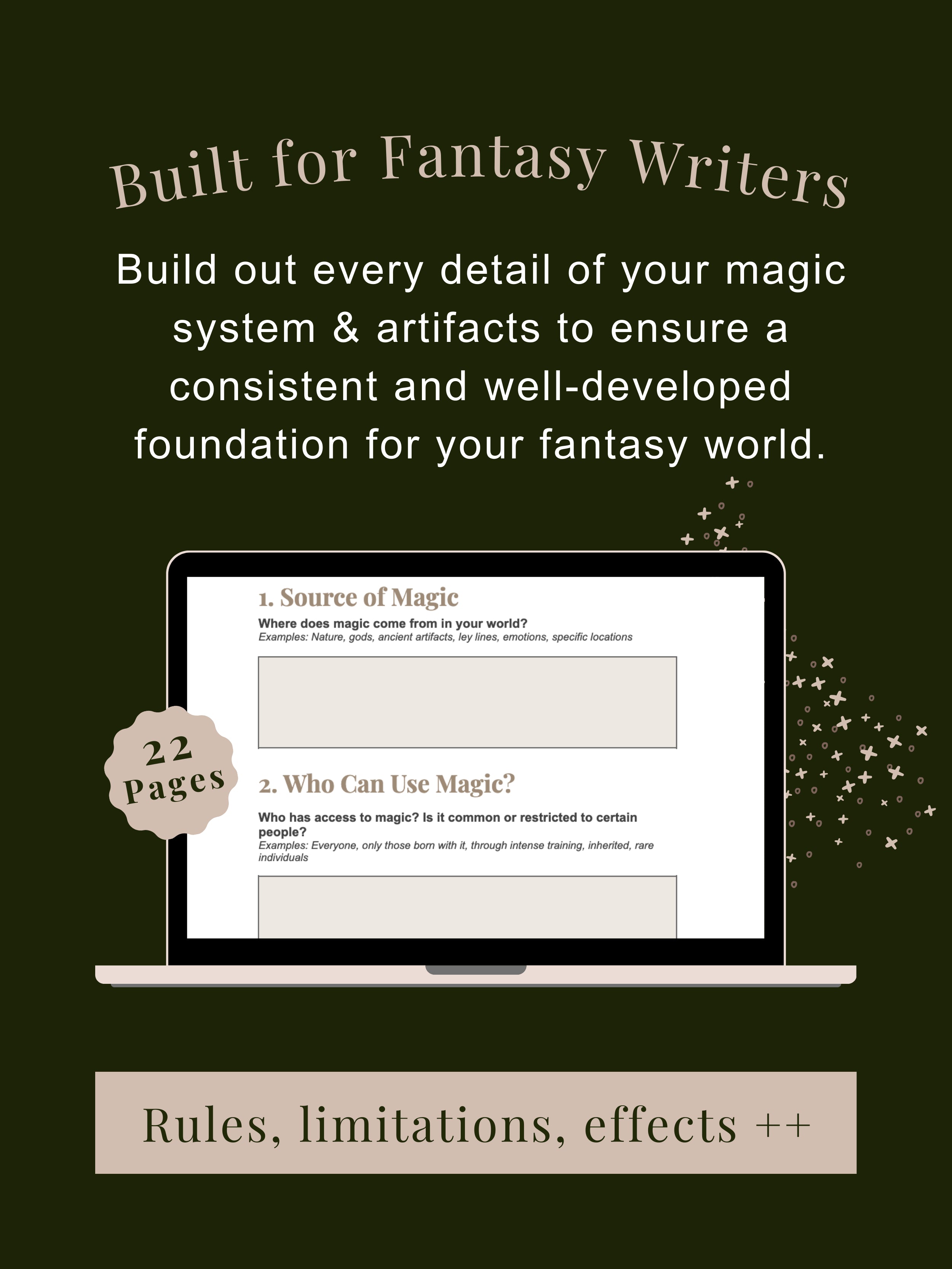 Build a rich and unique magic system for your fantasy world with this comprehensive Magic System Template PDF and Workbook! This digital guide helps you define every aspect of your world’s magic, from its source and users to powerful artifacts that shape your story.