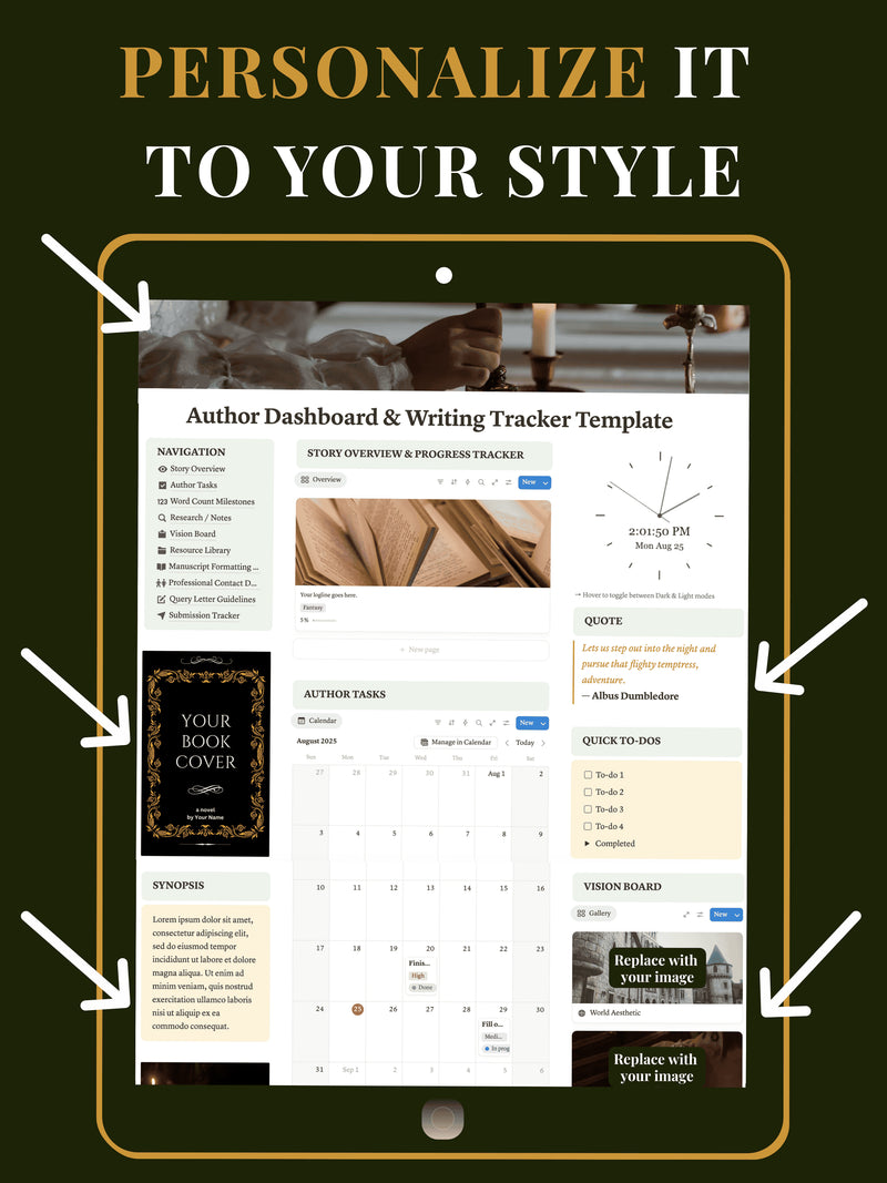 The Notion Author Dashboard & Writing Tracker is your new HQ: a polished, intuitive Notion workspace where planning, writing, research, and submissions come together.