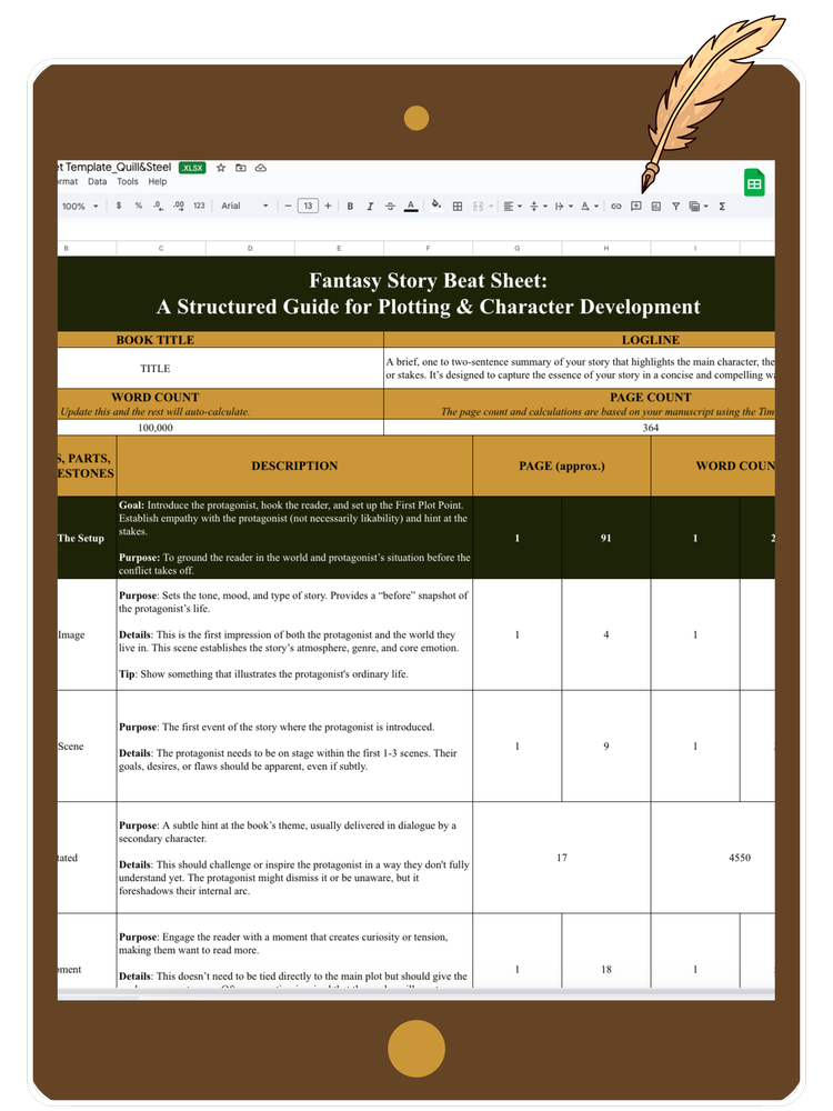 But if you want to outline the entire plot of your novel, beat by beat, my Beat Sheet Template gives you a clear roadmap with pre-filled descriptions, word & page count formulas, and examples to guide you.