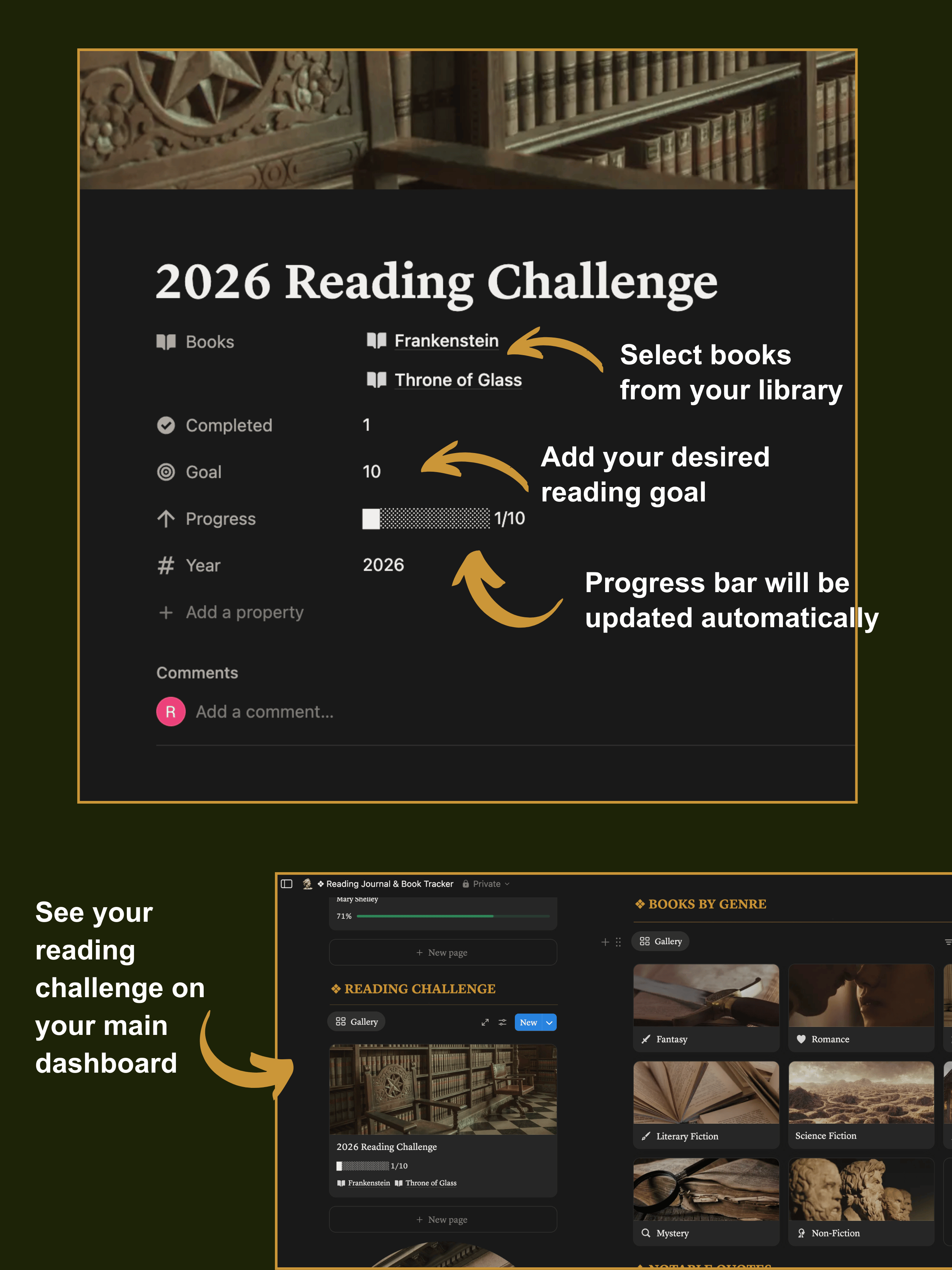 Update a book’s status or pages read. Your reading progress bars and yearly reading challenge will auto-update.