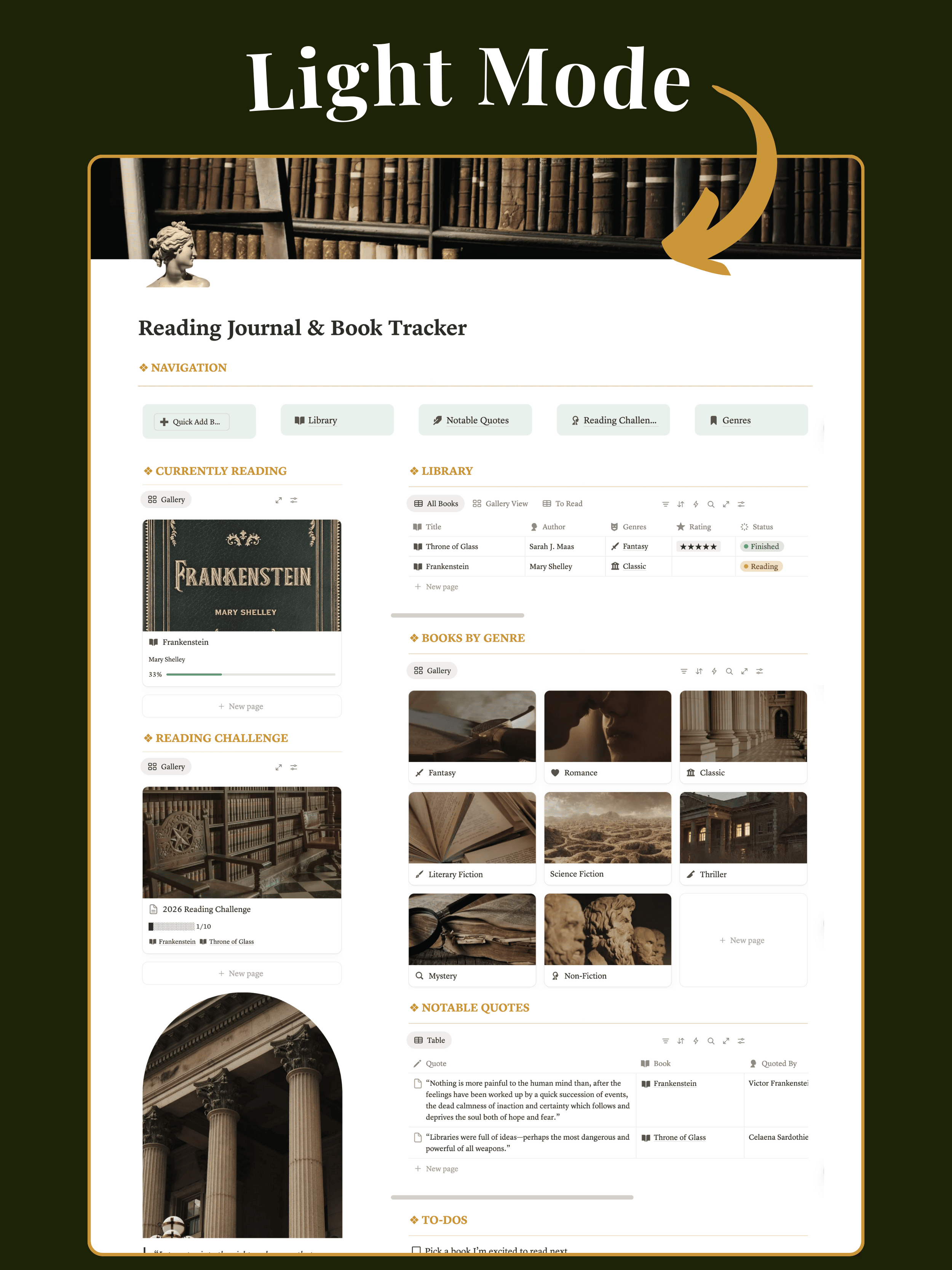 Add every book you read (or plan to read) with author, genre, start and finish dates, ratings, reviews, and quotes.
