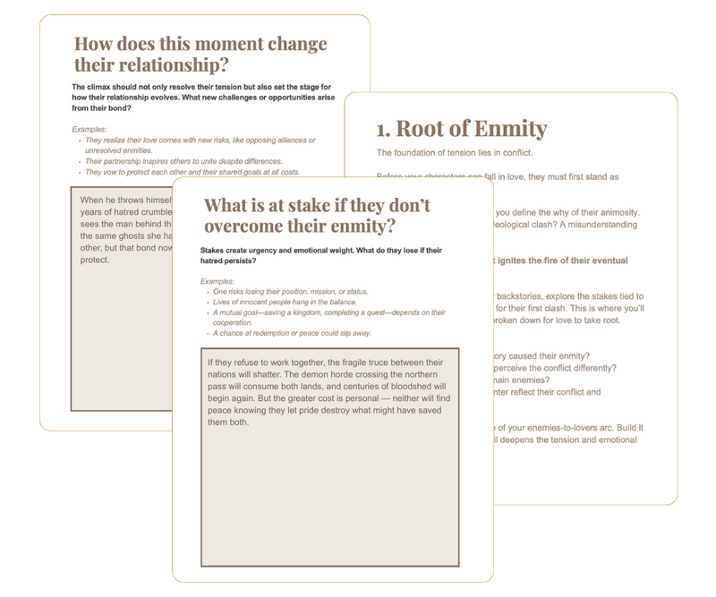 Discover the ultimate Enemies to Lovers Workbook packed with prompts, examples, and guidance to build compelling character arcs, build tension, and create slow-burn romance.
