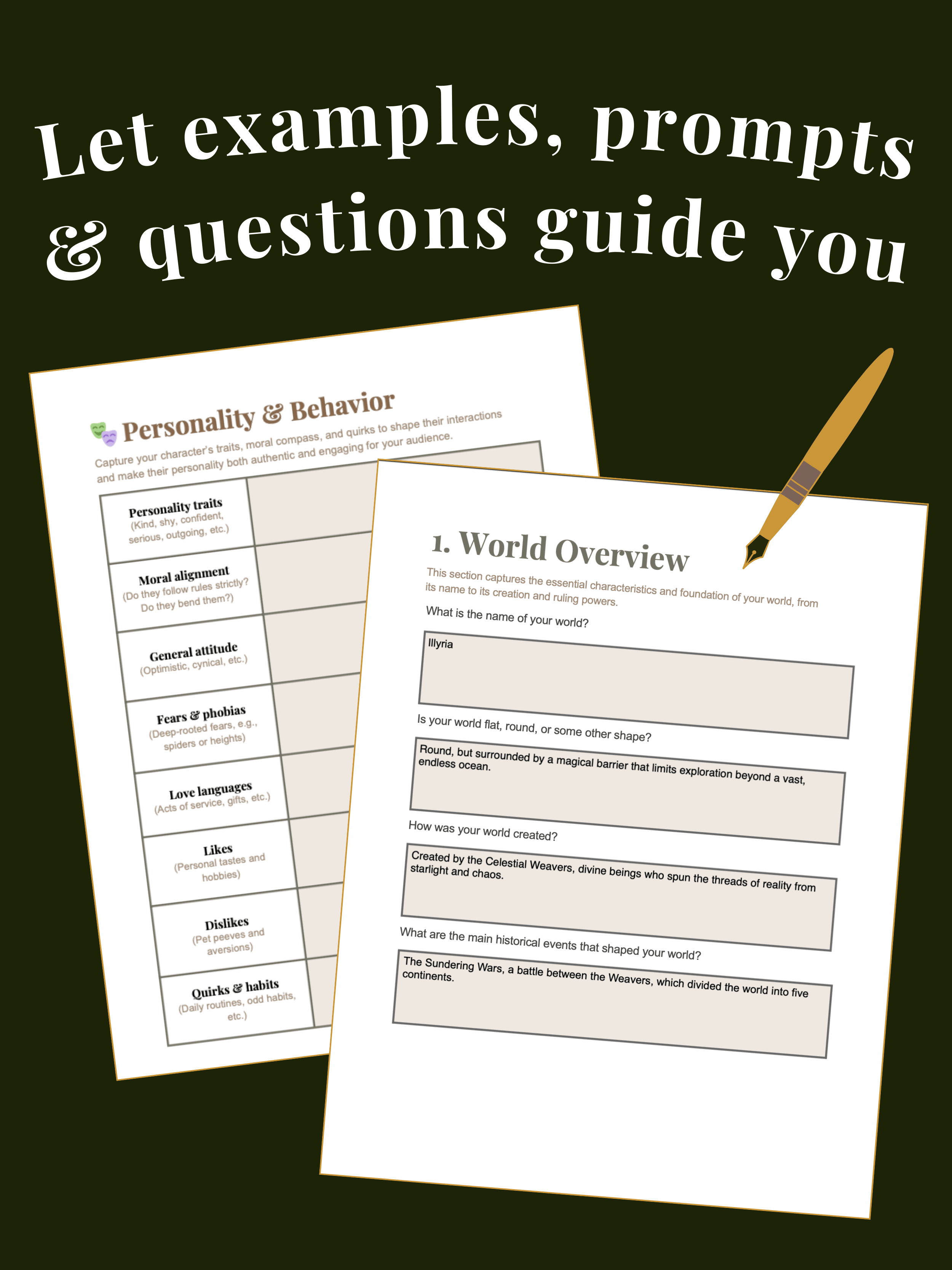 Absolutely. The prompts and worksheets are designed to guide you step by step, even if this is your first novel. You don’t need to be an “experienced” worldbuilder to get value. These are practical tools that help you stay organized and creative from page one.